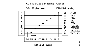 Interface types supported are V.35, EIA/TIA 449, EIA/TIA 530, X.21 with one clock source, and X.21 with two clock sources. The cable configurations for these interfaces are shown in Figure 4-10 through Figure 4-14. Only the pins that are connected to the SwitchProbe are shown. Pins that go straight through, connecting DTE to DCE, are not shown.