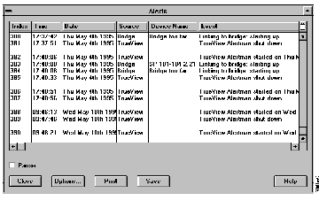 1. The screen displays the main Alert Manager window with the list of alerts that have occurred. When a new alert occurs, a corresponding message scrolls onto the bottom of the list.
