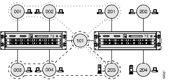 In Figure B-2, two impermeable virtual LANs both include a ring that has servers attached. The first virtual LAN includes rings 001, 002, 101, 201 and 203, and the second includes rings 003, 004, 101 and 203. Broadcast frames are restricted to the list of rings that belong to the virtual LAN and are not forwarded from either virtual LAN onto rings that only belong to the other.