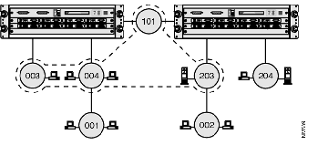 In Figure B-3, a permeable virtual LAN includes rings 101, 003, 004 and 203. However, because the virtual LAN is permeable, rings 001 and 002 can forward broadcast frames onto the virtual LAN, and receive broadcast frames from inside the virtual LAN.