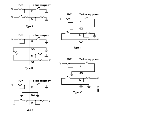 Each of the five types is illustrated in Figure G-1. The illustrations in this figure are abstracted from the specifications to show the essential components of the signalling circuitry. In this Figure G-1, the symbol V refers to battery voltage, which can be 25 Vdc to 65 Vdc, and is usually (nominally) -48 Vdc. Each of the illustrations in the figure show the PBX's E&M interface on the left, and the corresponding tie line equipment interface on the right.
