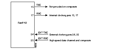 Internal clock applications are normally used when connecting a DTE device to the FastPAD. For internal clocking, the data channel provides two clocks, Transmit Clock (RS-232 equivalent pin 15) is used by the attached device to clock data to the FastPAD, Receive Clock (RS-232 equivalent pin 17) is used by the FastPAD to clock incoming data. When the attached device is a DTE, a straight-through cable is used to connect it to the FastPAD.
