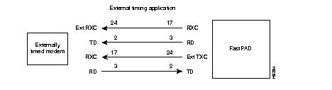 External clock applications are normally used when connecting a device that can accept Transmit Clock and provide Receive Clock to the FastPAD. Based on this selection, a low speed data channel provides Receive Clock (RS-232 equivalent pin 17) and accepts Transmit Clock (RS-232 equivalent pin 24). In this mode, the attached device accepts the FastPAD data channel clock and loops it back to the FastPAD. When the attached device is a DCE, a crossover cable is used to connect it to the FastPAD data channel.
