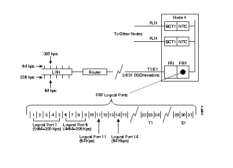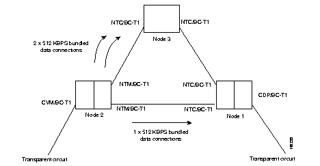 To achieve full T1 and E1 rates on a single CDP or CVM, TDM Transport supports inverse multiplexing. Figure 1-32 shows a simple example. In this example, the three, bundled 512-Kbps data connections symbolized by the arrows add up to a T1 connection.