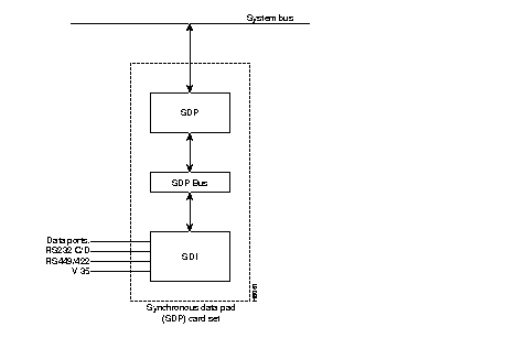 The SDP front card in an IPX Data PAD group is a programmable communications processor that can support one to four medium speed, synchronous data channels. It operates at speeds from 1.2 Kbps up through 1.024 Mbps on all four ports while performing link error monitoring. Operation to 1.344 Mbps per port is permitted with link error monitoring disabled.