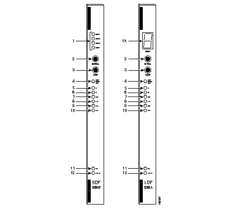 The SDP synchronous data PAD card is installed in a front slot that has an SDP or UB-240 utility bus and an SDI back card. The SDI back card provides the proper data channel interface. The faceplate of the SDP/LDP has message lights and control buttons for loopback control and signal monitoring.