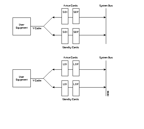 The CDP, BC-T1, BC-E1, BC-J1 can have a 1:1 redundancy configuration through a second, identical card set and a Y-cable to connect it to the trunk or circuit line. Figure 1-30 illustrates the redundant setup.