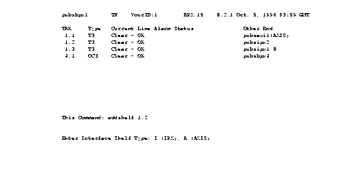 The following are example screens of (addshelf) at the BPX and (dspnode) at the BPX and at the IPX.