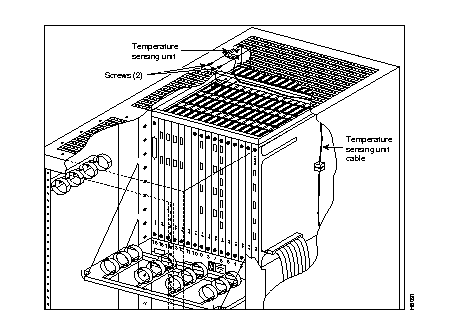 Step 6 Remove two screws and lock washers that attach the temperature sensing unit to the card cage and remove the temperature sensor.