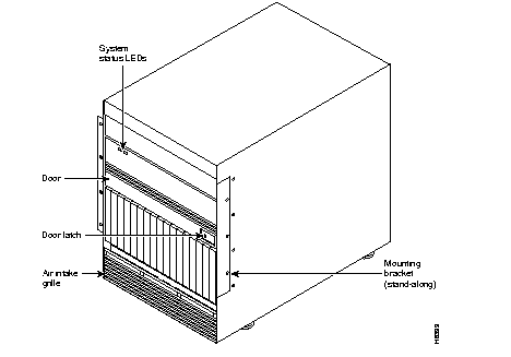 The stand-alone enclosure holds all of the system modules, power modules, power supplies, and cooling fans. The IGX 8 cabinet contains one eight-slot card cage with a backplane into which front cards plug, three auxiliary slots, a fan tray with four fans, an exhaust plenum, a power entry module, and an optional AC Power Tray that holds up to four power supplies. Figure 2-3 is a front view of the IGX 8 stand-alone.