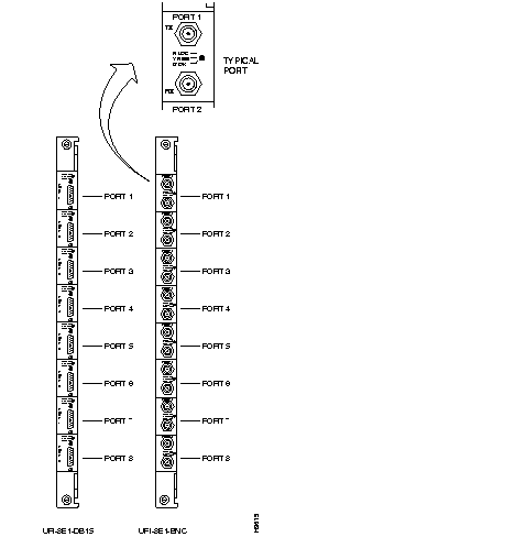 The back cards for the UVM are the BC-UVI-2T1EC and BC-UVI-2E1EC. Each back card has two ports. You can use one port for communication with user-equipment and optionally use the other port for passing through unprocessed logical channels to another UVM. (See the forthcoming section titled "Channel Pass-Through .")