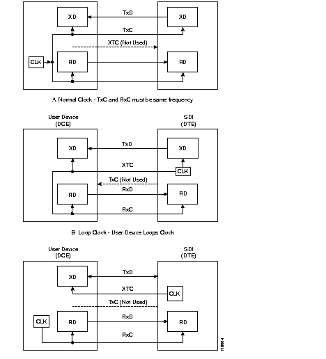 Three clocking modes are available on the SDI for clocking in transmit data and clocking out receive data. In addition, the SDI can operate as either a DCE or DTE, which makes possible six combinations of clocking. (See Figure 4-35 and Figure 4-36 .) With loop clocking, the user device must loop the RxC to the XTC for clocking out the transmit data.