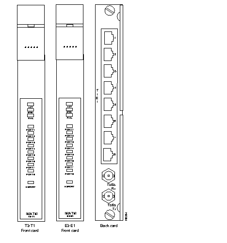The Frame Service Module (FRSM) is a two-card set consisting of an FRSM front card (channelized or fractional, T1 or E1, 4 port or 8 port), and either a 4 T1, 4 E1, 8T1, or 8E1 back card. Up to ten FRSMs may be installed in a shelf in slots 5 through 14. Example FRSM front cards are shown in Figure 4-4.