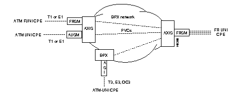 Using AXIS, FR-ATM network interworking permits a permanent virtual connection to be established between two frame relay service users over a Stratagem or multi-vendor network. Across the network the traffic is carried in ATM cells.