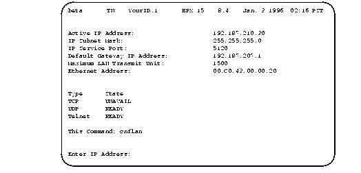 For access to the node using an Internet connection, the Internet Protocol (IP) address, IP subnet mask, TCP service port, and gateway IP address must be entered by the user with the cnflan command.