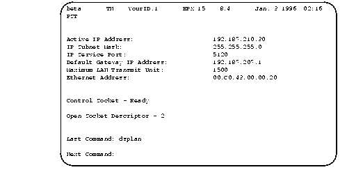 A cnflan screen is shown in Figure 7-15 for the LAN setup shown in Figure 7-16. An IP address of 192.187.210.30 has been entered as the active IP address for the node. The IP Subnet mask is entered as 255.255.255.0 for a Class C LAN network. The TCP service port is entered as 5120. Since the workstation and node are on different networks in this example, a gateway address of 192.187.207.1 (the address of the node serving as a gateway for SV+, in this example), which must be obtained from your System Administrator, has been entered. If the workstation and node are both on the same network, no gateway address is needed. The "Maximum LAN Transmit Unit" and "Ethernet Address" parameters are not configurable by the cnflan command. The "Ethernet Address" is a hardware address that is different for every node controller card, e.g., BCC.