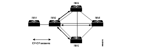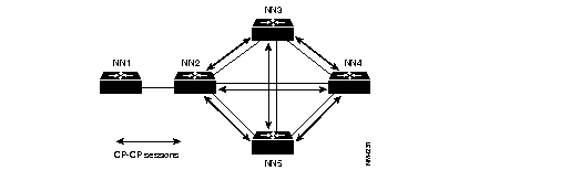 For example, in Figure 6-9, NN2, NN3, NN4, and NN5 are in a fully meshed network. Every network node establishes CP-CP sessions with its adjacent network nodes. This means that NN2 establishes CP-CP sessions with NN3, NN4, and NN5. NN3 establishes CP-CP sessions with NN2, NN4, NN5, and so forth.