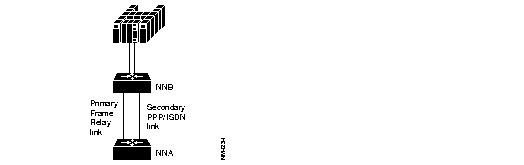 In Figure 6-14, the Frame Relay link is the primary link and the ISDN dial link is the backup link. The requirement is that the ISDN link provides instantaneous backup for the primary link and it remains inactive until the primary link goes down. No manual intervention is needed. To support this, NNA needs to define two parallel transmission groups to NNB.