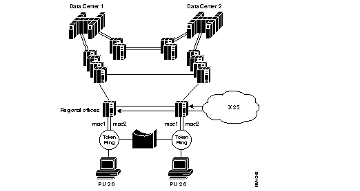 As Figure 6-23 shows, the FEPs at the regional office continue to provide boundary functions to the Token Ring and X.25-attached devices. The two DLSw+ routers handle the traffic between the FEP at Data Center 1 and the FEP at the regional office. SNA COS is preserved in this environment.