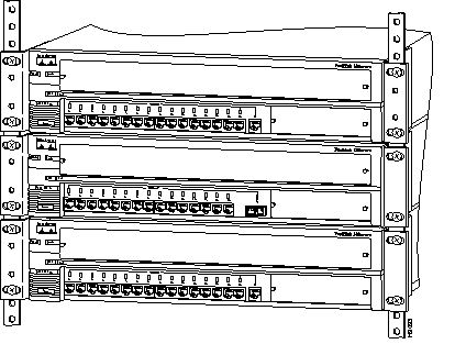 Figure 9-1 shows a front view of the FastHub 316T, Figure 9-2 shows a front view of the FastHub 316C, Figure 9-3 shows three FastHub 300 series hubs in a rack-mount installation, and Figure 9-4 shows the rear view of a stack of FastHub 300 series hubs.