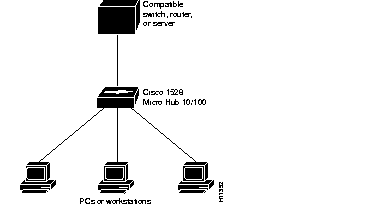The hub can provide a connection between a compatible switch, router, or server and PCs or workstations as shown in Figure A-2. To be considered compatible, a switch, router, server, PC, or workstation must support either 10BaseT or 100BaseTX. For example, the Cisco 1548 Micro Switch 10/100 or any of the Cisco 1600 series routers are compatible devices.