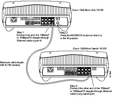 Note If you are connecting a compatible switch or another Cisco 1528 Micro Hub 10/100, you can also use a crossover Ethernet cable. For more information on the crossover Ethernet cable, refer to the
