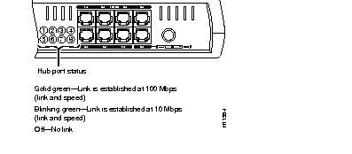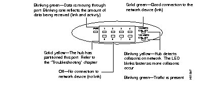 After connecting network devices to the hub ports, check the corresponding port LEDs (labeled 1 through 8) on the front and back panels. The color and blinking pattern of the LEDs indicate the activity for the corresponding hub port.