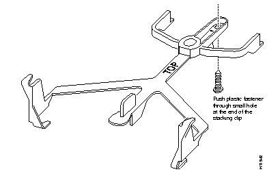 Each Cisco product designed to be stacked with the hub comes with a stacking clip and a fastener to keep multiple devices together in a stack. Assemble the clip and the fastener as shown in this figure.
