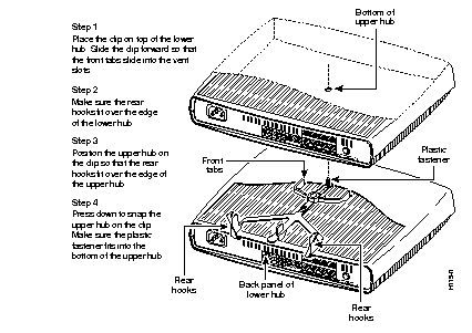 Note Although the following figure shows how to stack hubs, these instructions also apply to other Cisco products designed to be stacked with the hub, except for the Cisco 1600 series router.