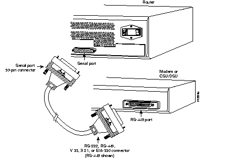 Step 2 Attach the V.35, RS-232, RS-449, EIA-530, or X.21 end of the cable to the channel service unit/data service unit (CSU/DSU) or modem. (See Figure 3-3.)