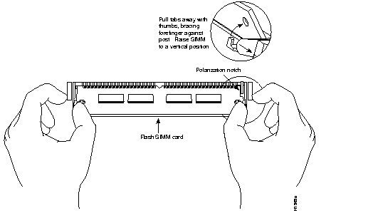 Step 4 Gently spread the Flash memory SIMM connector hold-downs until they are wide enough to permit you to remove the Flash memory SIMM. (See Figure 5.)