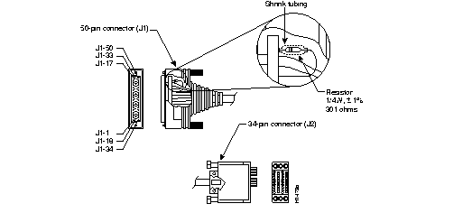 Figure A-3 shows the V.35 cable assembly with the resistor (301 ohms, 1/4 watt, ±1%), and Table A-7 and Table A-8 list the V.35 cable pinouts and signal descriptions.