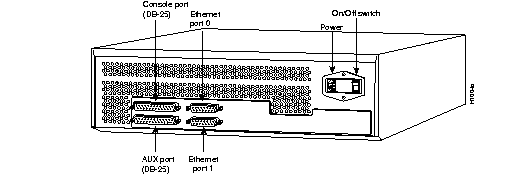 When viewed from the rear, the power cable and power switch appear on the right side of the chassis. The ports for the system console, auxiliary (AUX), LAN (Token Ring, Ethernet, or BRI), and serial line appear to the left of the power cable and switch. The configuration depends on which model you purchase. Refer to Figures 2-2 through 2-7 for rear views of the different router configurations.