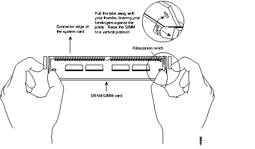 Step 2 Remove any existing DRAM SIMM. While pulling outward on the tabs to unlatch them, raise the SIMM to the vertical position and remove it from the SIMM socket. (See Figure 5.)