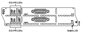 Figure 25 and Figure 26 show CE1/PRI module LEDs. The same LEDs are used for balanced (120-ohm) and unbalanced (75-ohm) E1 interfaces.