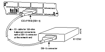 To connect a CE1/PRI-B (120-ohm) module, use the appropriate cable to connect the CE1/PRI-B port to an E1 CSU. (See Figure 12, Figure 13, and Figure 14, showing DB-15, Twinax, and RJ-45 CSUs respectively.)