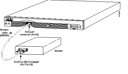 Step 1 Connect a modem to the auxiliary port using an RJ-45 rollover cable with an RJ-45-to-DB-25 adapter. (See Figure 3-38.) The provided adapter is labeled Modem. For information about cable pinouts, see the appendix "Cable Specifications."