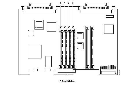 The router contains four 72-pin SIMM sockets (or banks) for DRAM. (See Figure A-3.) Each socket can be filled with a single 32-bit-wide 72-pin DRAM SIMM. DRAM can be configured as a mixture of shared memory, which is used for data transmitted or received by network modules and WAN interface cards, and primary or main memory, which is reserved for the CPU.