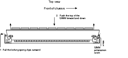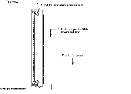 Step 3 Remove one SIMM at a time, beginning with the SIMM in bank 3. To lift the SIMM out of its socket, pull the locking spring clips on both sides outward and tilt the SIMM toward the right side of the chassis, free of the clips. (See Figure A-5.)