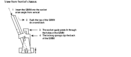 Step 3 Referring to Figure A-9, insert the Flash memory SIMM into its connector slot at an angle, tilted toward the left side of the chassis. Rock the SIMM into a vertical position (see Figure A-6) using the minimum amount of force required. When the SIMM is properly seated, the socket guide posts fit through the alignment holes, and the locking springs click into place. Use the minimum amount of force required.