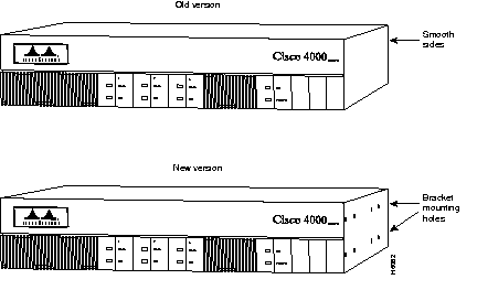Cisco 4000 series routers have two chassis versions. (See Figure 1.) In the old version of the chassis, the rack-mount and wall-mount brackets are secured to the chassis with tabs located on the inside of the chassis shell. Newer versions of the chassis use screws to attach the brackets to the side of the chassis shell. The rack-mount and the wall-mount brackets supplied with this kit can be used with both types of chassis.