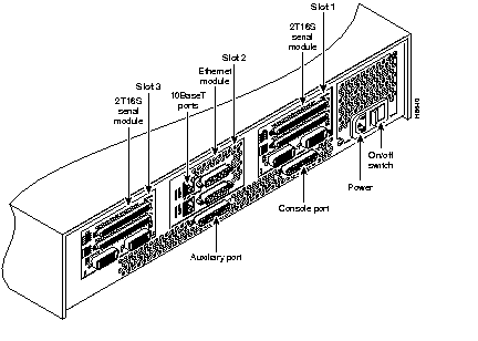 The power cable and on/off switch are on the lower right of the rear panel of the router. The system console port, auxiliary port, and network processor module ports (labeled 2T16S serial module and Ethernet module in Figure 2) appear to the left of the power cable and switch.