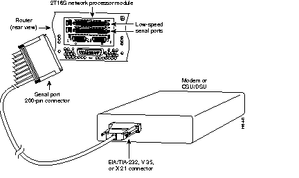 The 16 low-speed serial ports use two 200-pin D-type connectors. Use the specific serial transition cable for the module type and the correct connector for your modem or CSU/DSU connector type.