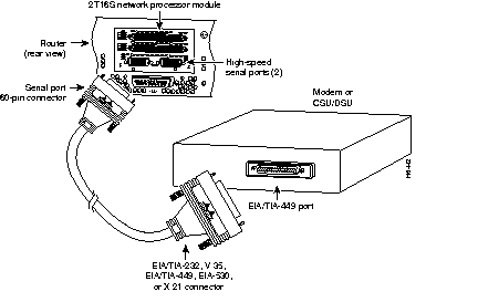 The two high-speed serial ports use 60-pin D-type connectors. Use the specific serial transition cable for the module type and the correct connector (EIA/TIA-232, V.35, X.21, EIA/TIA-449, or EIA-530) for your modem or CSU/DSU connector type.