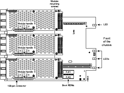 ![]() | Caution Some network processor modules are secured to the rear of the chassis with two external screws. On modules with external rear mounting screws, including multimode FDDI modules, you must remove these screws before the module can be safely lifted out of the chassis. |