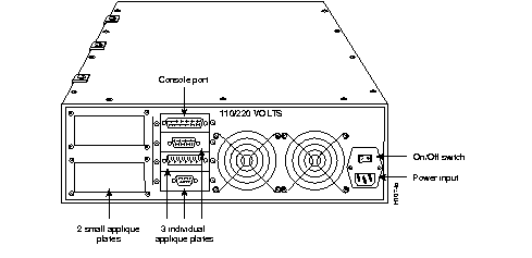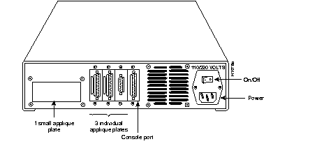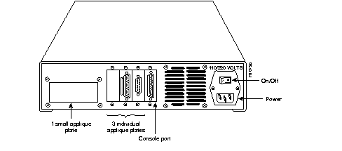 The CGS chassis can support a single multiport Ethernet, serial, or Token Ring interface card for external network connection. External connections to the network are provided by interface appliques attached to the rear of the chassis. These appliques are connected internally to the appropriate interface card by way of ribbon cables. Figure 1-4 shows the CGS rear panel and appliques.