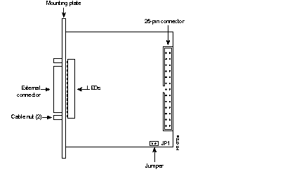 The HD V.35 applique has only one jumper (JP1), which selects Serial Clock Transmit (SCT) (to the DTE) or Serial Clock Transmit External (SCTE) (from the DTE) as the timing source for Signal Detect (SD) when the applique is in DCE mode. The default is SCTE (for DTE), which is selected when the JP1 jumper is in. To select SCT (for DCE), remove the jumper. The cable used determines the mode of the applique. The HD V.35 applique is illustrated in Figure A-6.