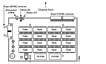 The CSC-MC+ has two LEDs on the front edge of the card. (See Figure B-6 and note the chassis front orientation of the illustration.) When viewed with the card installed in the card cage, the green LED is on the left. The green LED is the power indicator and should be lit when power is on. The yellow LED is lit during Flash copy operations and will be off at all other times. When the write-protect jumper is removed, Flash memory cannot be overwritten or erased.