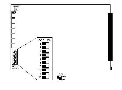 Ten DIP switches are located below the indicator LEDs on the Dual E1/PRI NAC (Figure 3). Of these, only DIP switches 1, 2, and 3 are functional at this time. DIP switches 1 and 2 are used to set the serial port rate of the EIA/TIA-232 interface. DIP switch 3 is used to enable or disable hardware flow control for the user interface port.