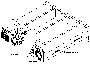 Step 4 Insert the middle fan as shown in Figure A-28, making sure that the cable feeds to your left. Position the cables to the two installed fans so that they will fit under the first and second fans. Press the fan into place between the four sheet metal tabs.